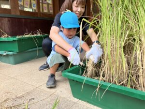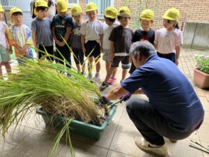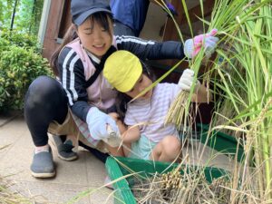 天候が悪く、急遽保育園に稲を持ってきていただきました。
